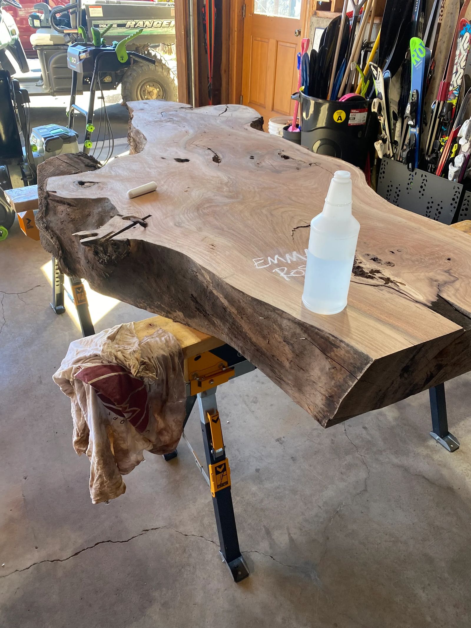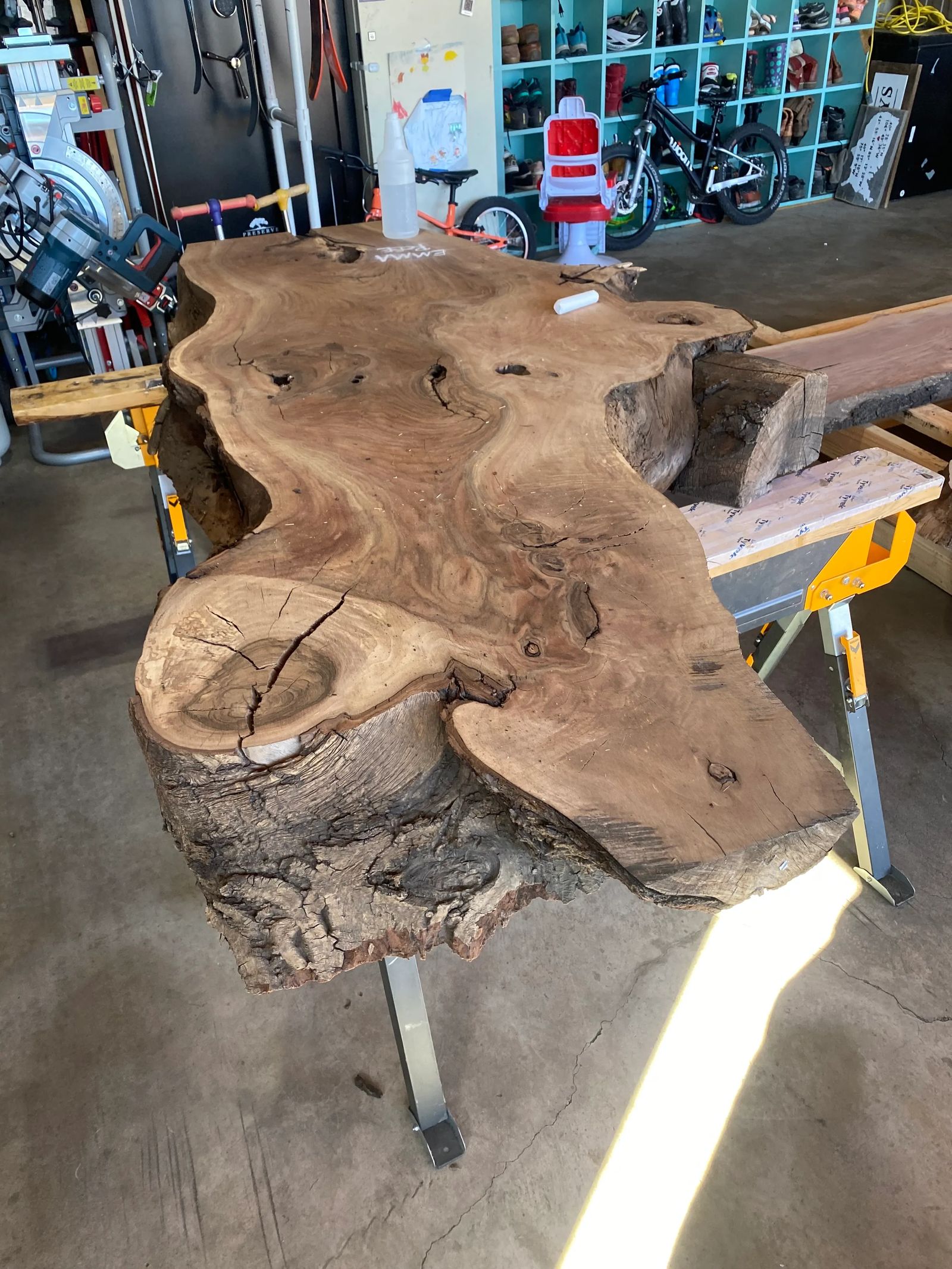 At this stage, the slab remains largely untouched. The wood is being studied—its grain, movement, and edge—before any cuts are made. This period is essential, allowing the final proportions and orientation to be determined with intention rather than assumption.