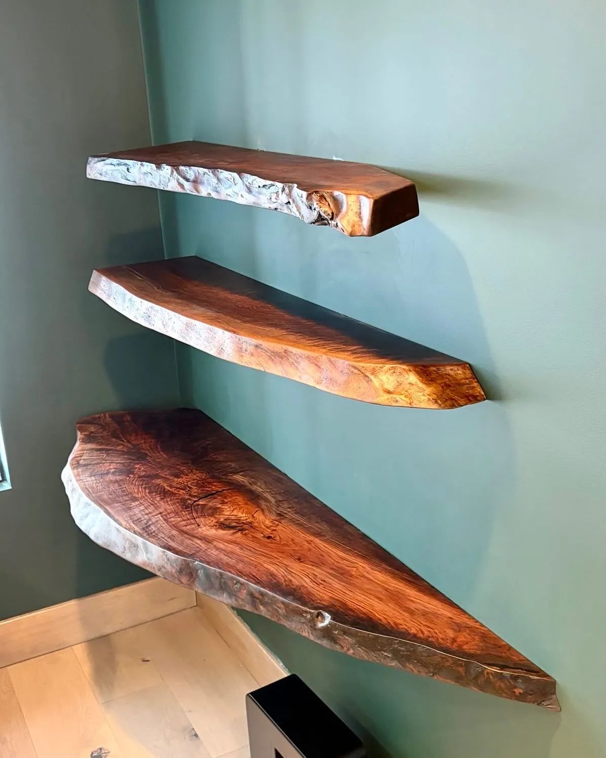 The thick walnut slabs were meticulously milled, refined, and finished to showcase their character while maintaining the clean, floating aesthetic our clients envisioned. Now in place, the shelves integrate seamlessly into the space, balancing strength, elegance, and the quiet luxury of natural wood.